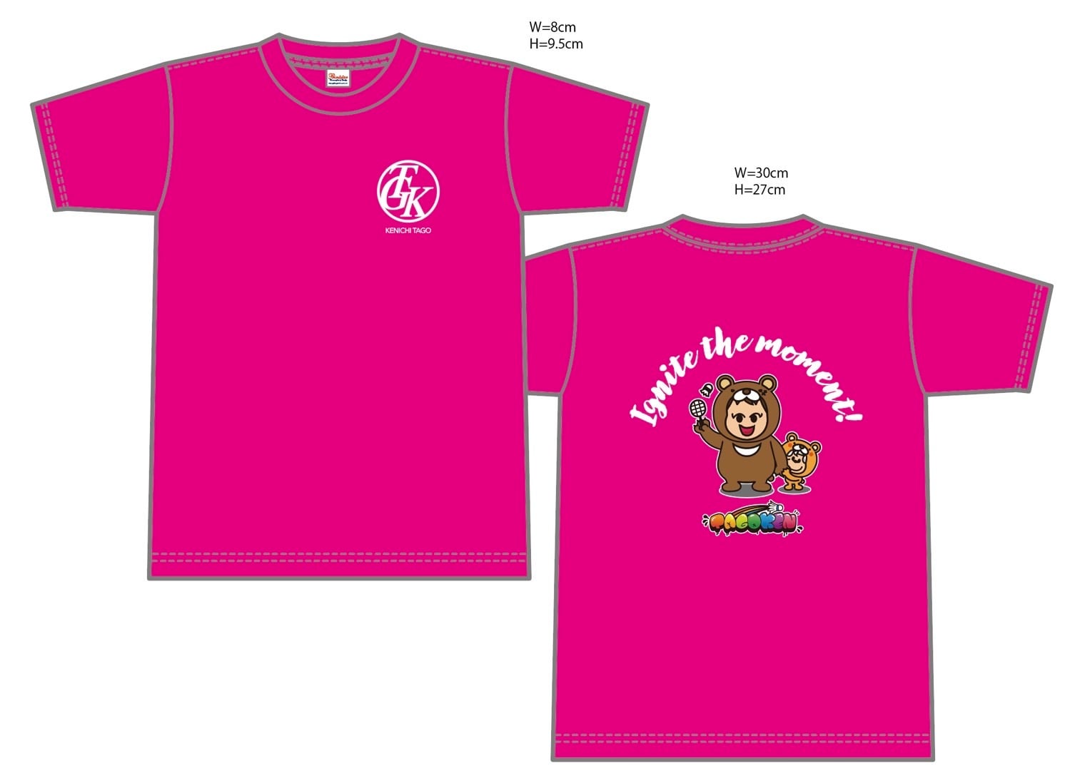 フロントはオリジナルのスタンプロゴをシルクスクリーンにて丁寧にプリント。背面には可愛い熊の被り物をしたTAGOKENとケンボーをプリントしています。